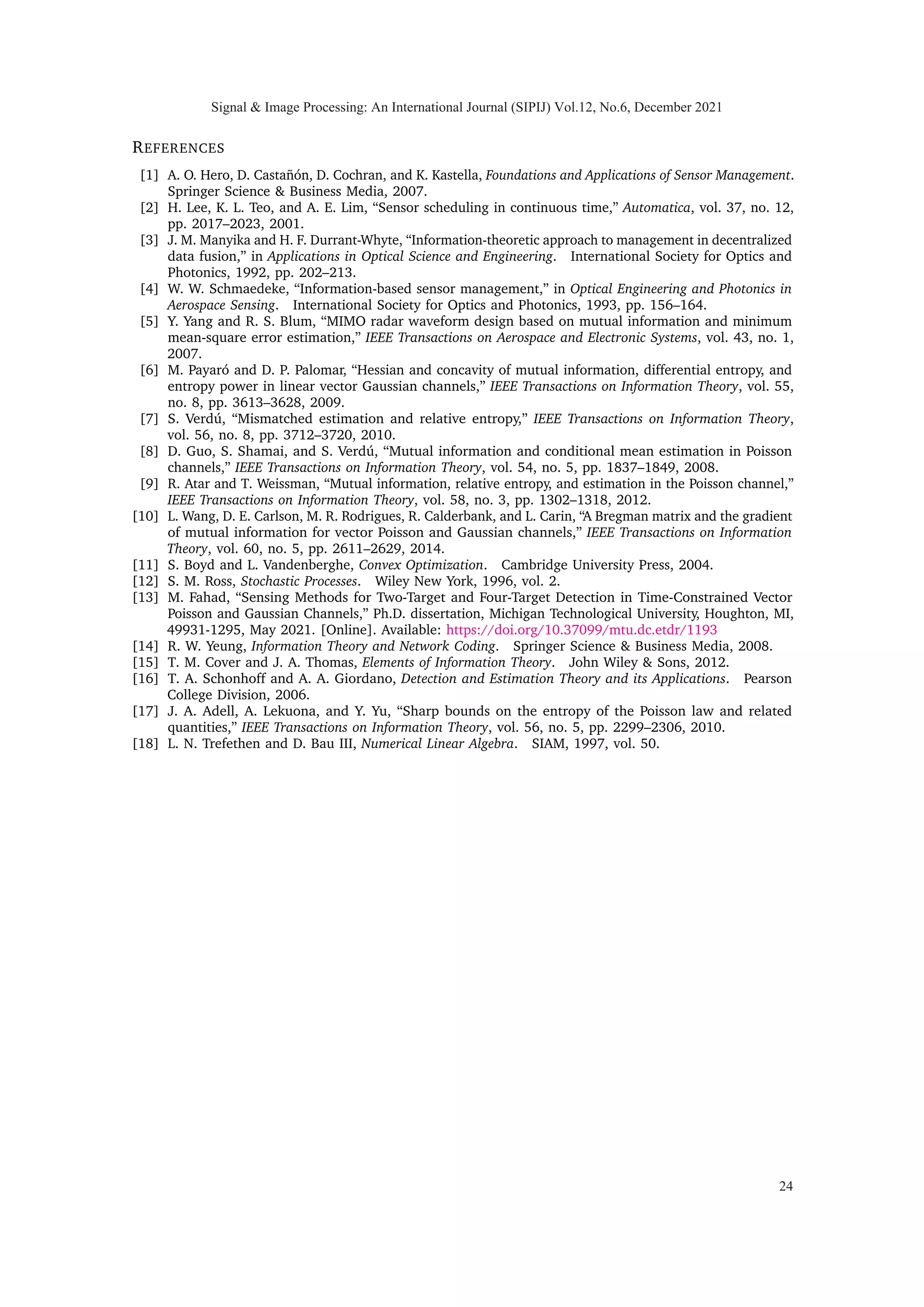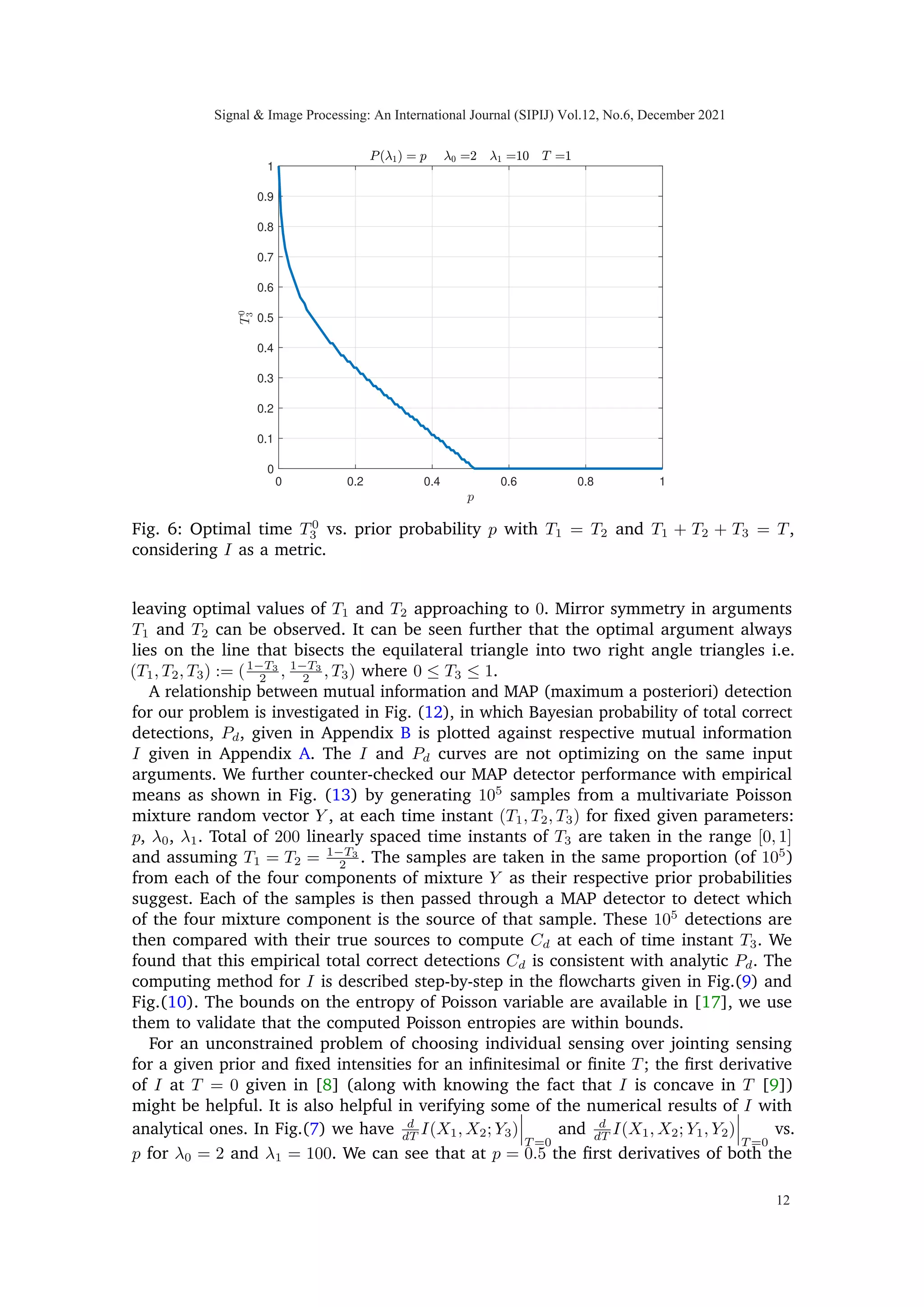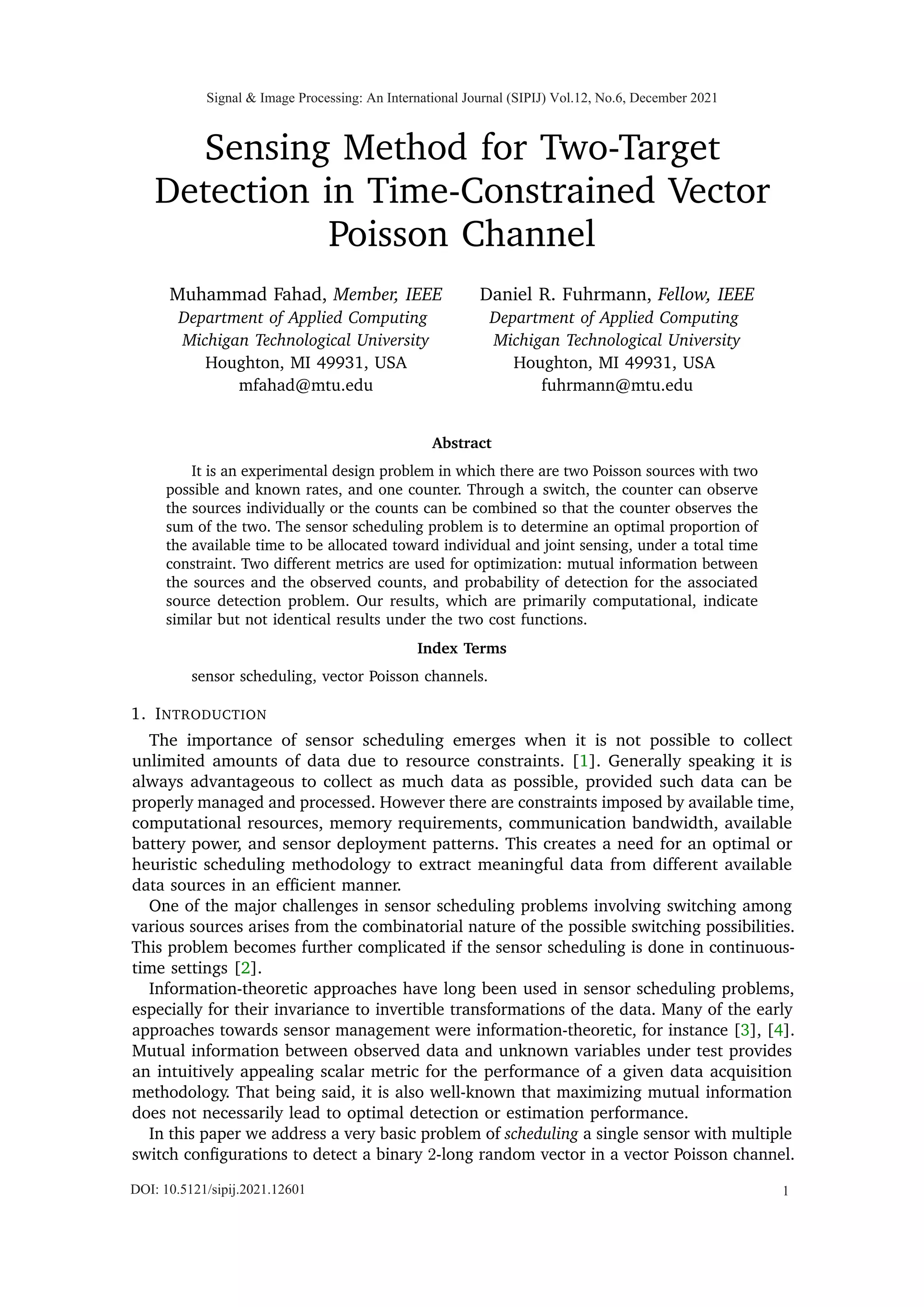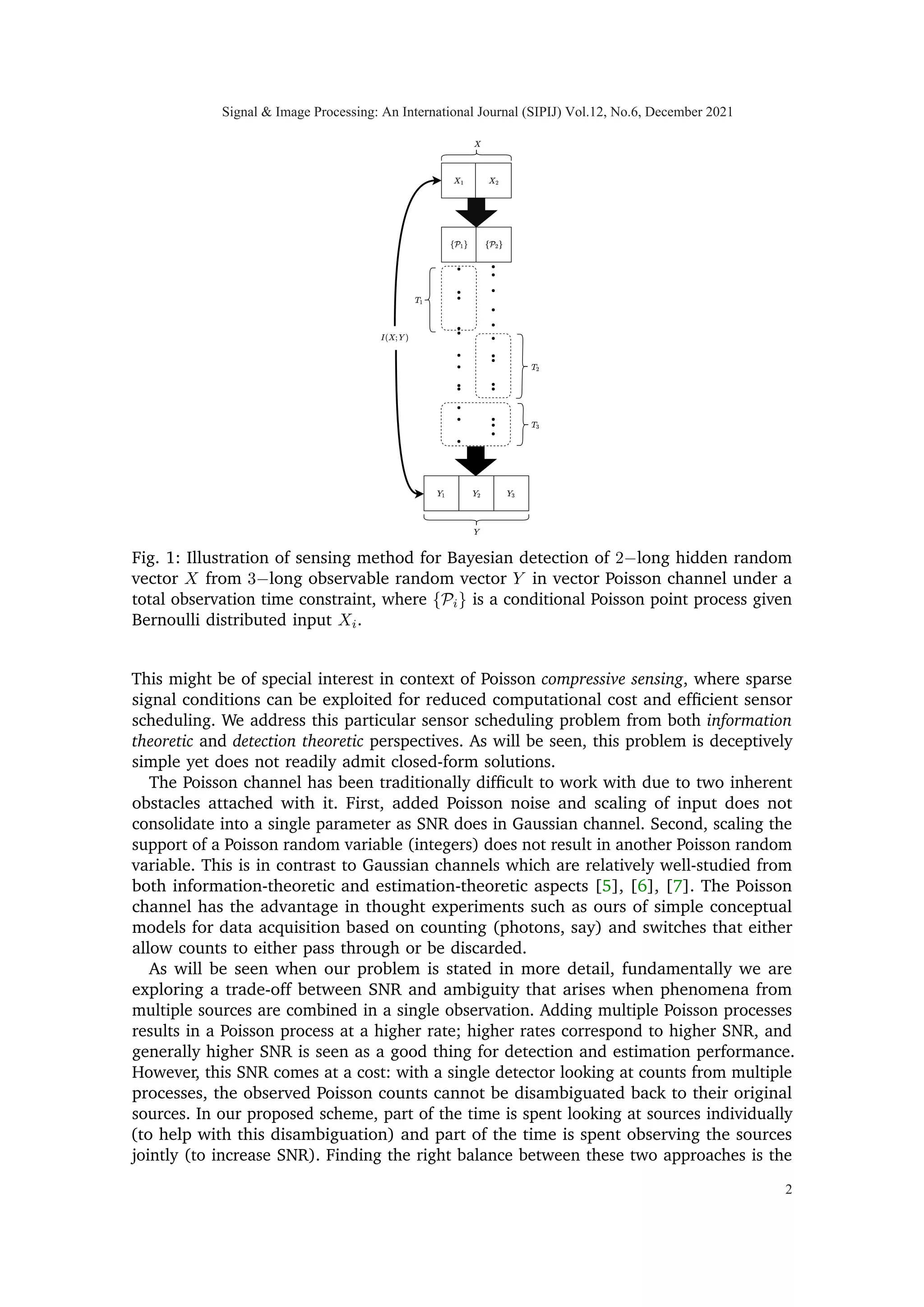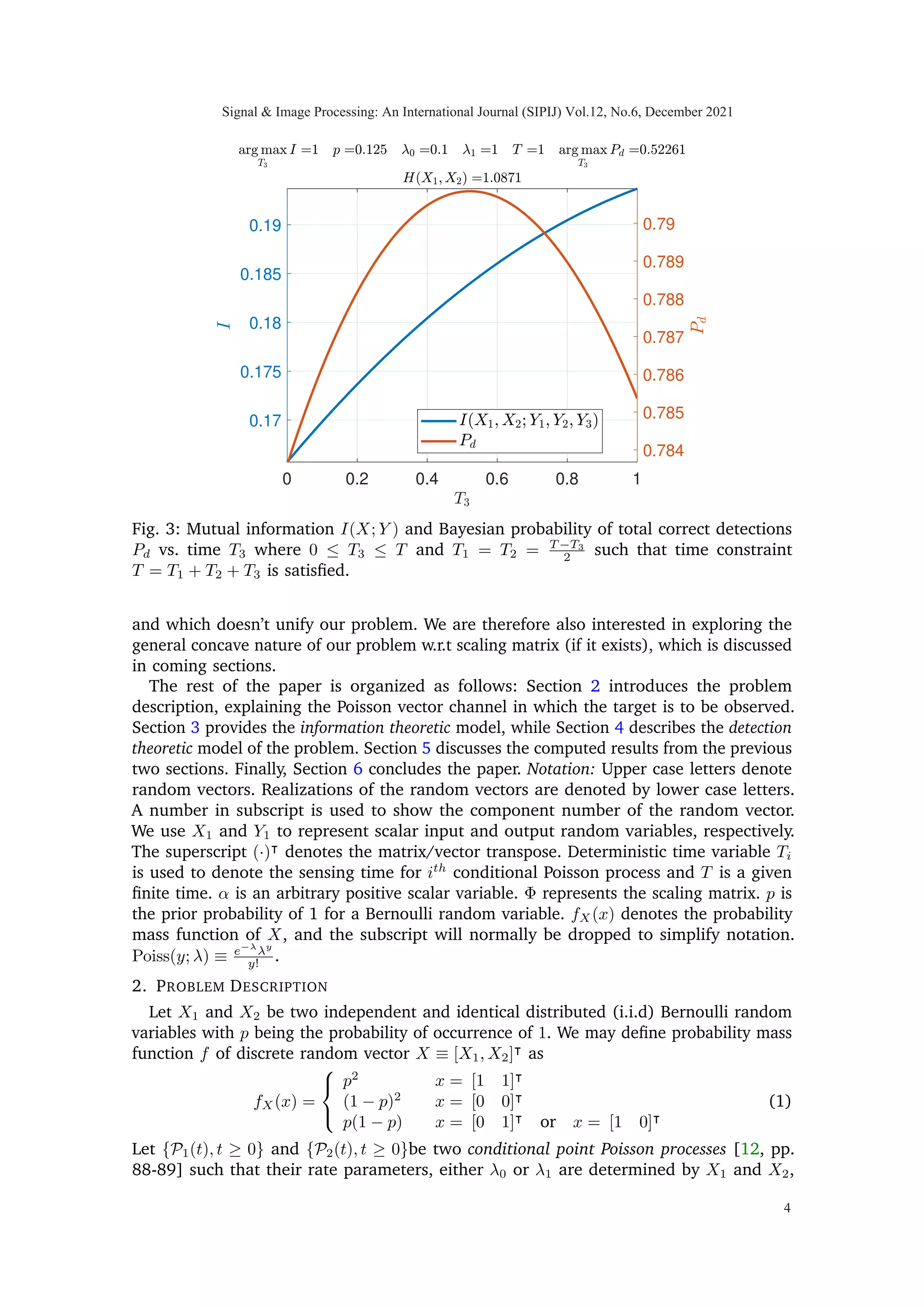 This document discusses a sensor scheduling problem for detecting two Poisson sources with known rates using a single counter under time constraints. The authors explore the trade-off between optimizing mutual information and detection probability through individual and joint sensing methods. The results indicate that optimizing these metrics can yield similar yet distinct outcomes, complicating the scheduling strategy in the context of vector Poisson channels.