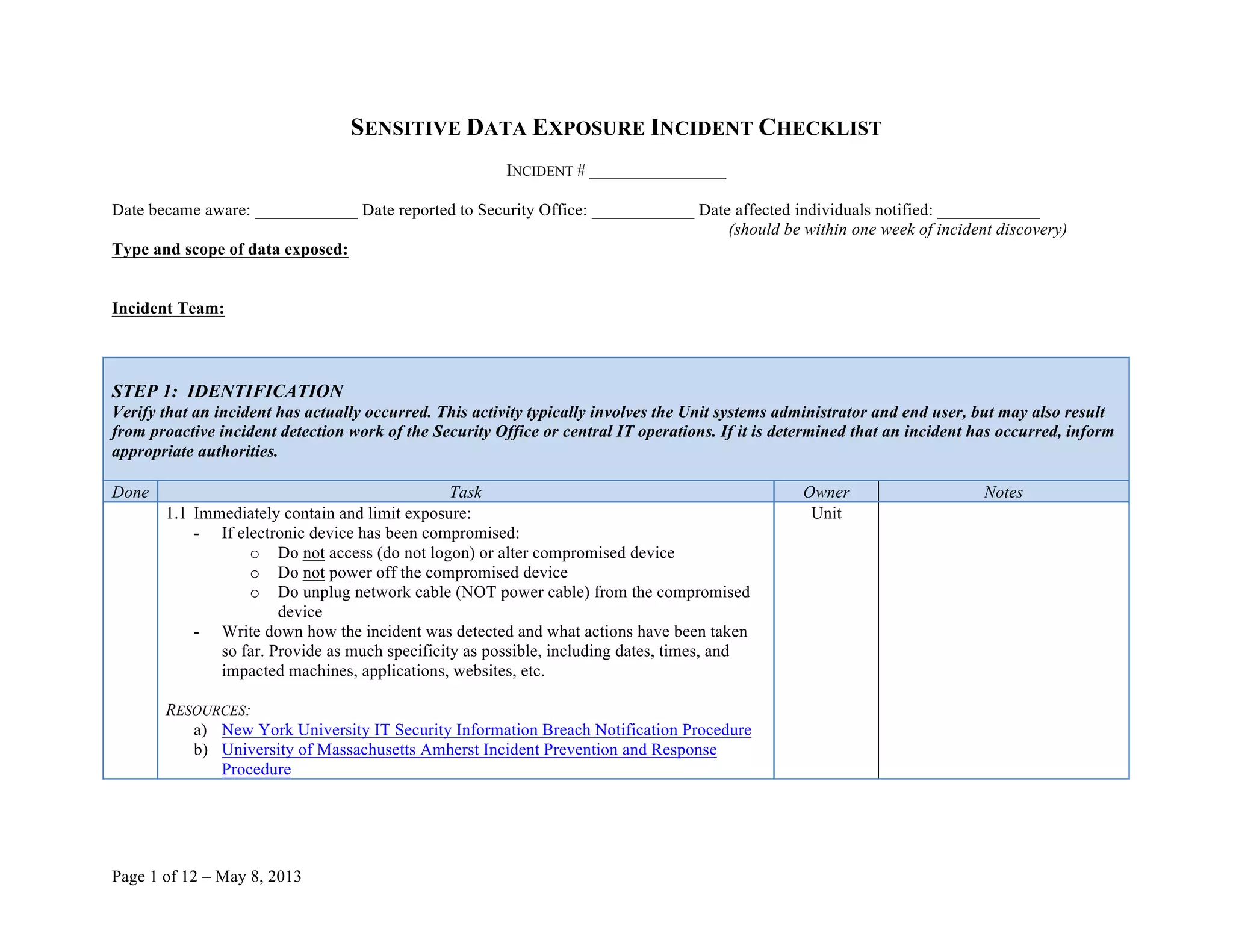 This document provides a checklist for responding to a sensitive data exposure incident with 12 steps. It details actions to identify and contain the incident, assess the damage and data exposure, eradicate vulnerabilities and recover systems, notify affected individuals, and follow up. The checklist contains over 100 sub-steps and references resources to help guide the incident response process.