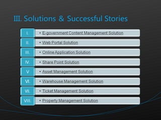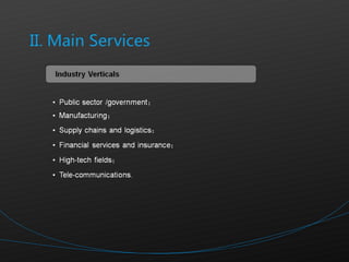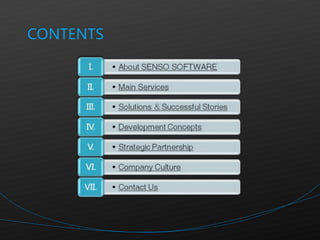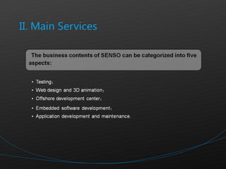 SENSO is an IT outsourcing service provider founded in 2002 that provides end-to-end outsourcing services including software development, 3D animation, and project management. It has experience working with clients in Europe, the US, Japan, South Korea, and China. SENSO promotes international standards and rigorous quality and security practices.