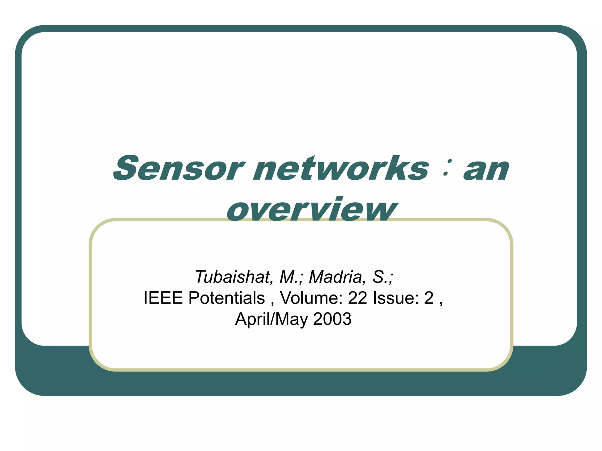 The document provides an overview of sensor networks, which consist of low-cost, low-power sensor devices that can collect, process, analyze, and disseminate data from various environments. Sensor networks enable information gathering and processing through reliable monitoring using small, wireless sensor nodes. Key challenges for sensor networks include extending the lifetime of the network given limited energy resources and adapting to changing topologies as nodes fail or move. Sensor networks operate using self-organizing, multi-hop wireless connections between nodes that coordinate sensing tasks and route data back to central access points.