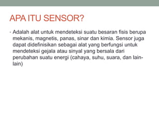Dokumen ini menjelaskan tentang berbagai jenis sensor dan aktuator yang digunakan dalam sistem robotik, termasuk sensor suhu, cahaya, suara, tekanan, dan giroskop. Selain itu, juga diuraikan tentang aktuator seperti motor DC, servo, stepper, dan solenoid, masing-masing dengan fungsi serta aplikasi yang berbeda. Informasi ini penting untuk memahami komponen utama dalam mekatronika dan aplikasinya dalam teknologi modern.