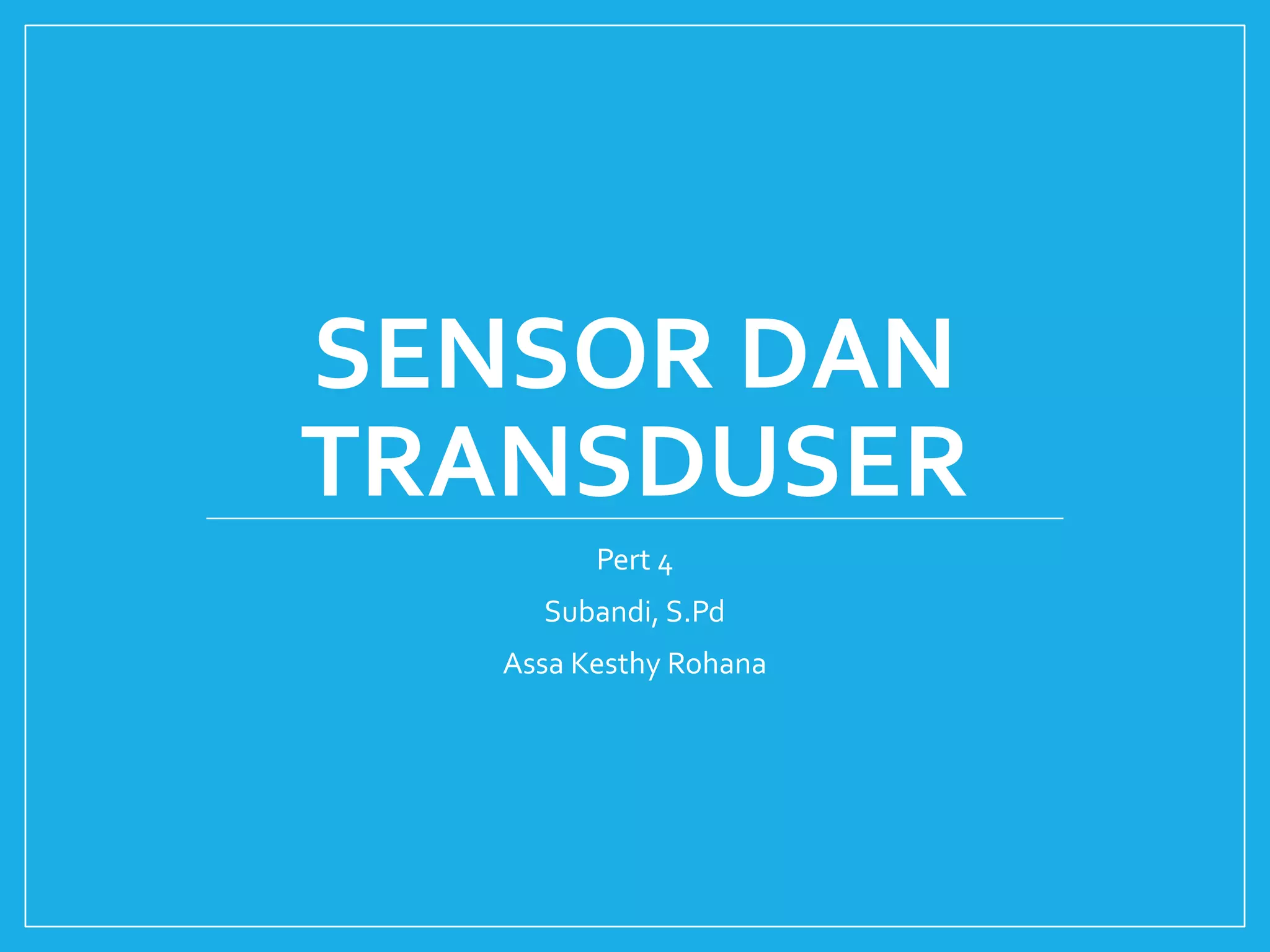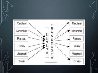 Dokumen ini membahas tentang sensor dan transduser, menjelaskan bahwa sensor adalah alat untuk mendeteksi berbagai besaran fisik dan mengubahnya menjadi sinyal listrik. Berbagai jenis sensor dijelaskan, termasuk sensor cahaya, suhu, radiasi, gerak, dan suara, beserta aplikasinya masing-masing. Selain itu, dokumen ini juga mencakup perbedaan antara sensor dan transduser serta pertanyaan terkait tentang fungsinya.