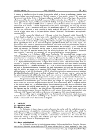 The document discusses the evaluation of sensors used in a hand grip strength glove, which includes flex and force-resisting sensors to assess grip strength in two modes: pencil grip and object grip. The system achieves a 90.8% accuracy in determining grip strength with real-time data analysis performed by a trained model using machine learning techniques. Key findings include the critical placement of sensors and the calibration processes necessary for accurate measurements of finger flexion and applied force.
