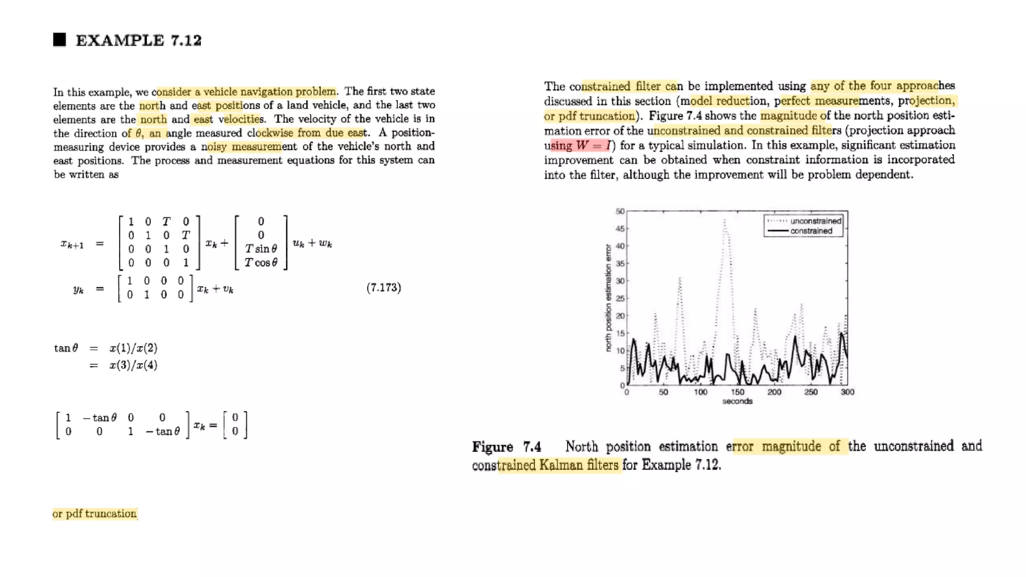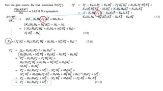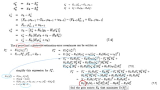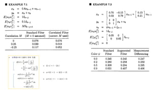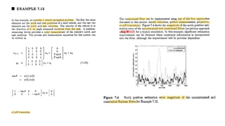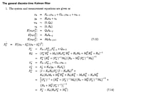 This document discusses several generalizations and modifications that can be made to the standard Kalman filter. Section 7.3 describes how a steady-state Kalman filter can be used instead of a time-varying filter when system dynamics are time-invariant. Section 7.4 discusses a fading memory filter that discounts older measurements to address cases when system dynamics are imperfectly known. Section 7.5 presents several approaches to incorporate state equality and inequality constraints into the Kalman filter formulation, including model reduction, projection approaches, and probability density function truncation.