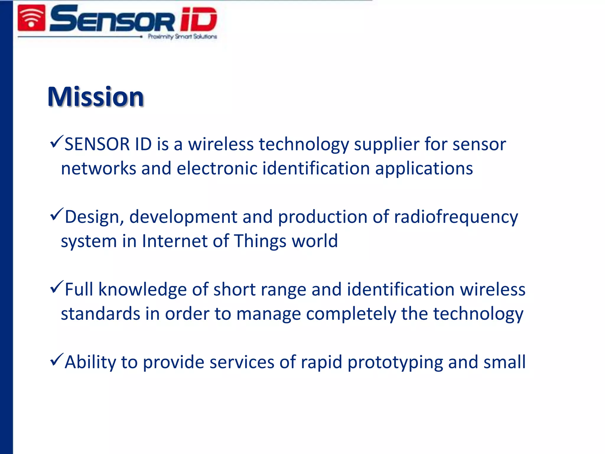 Sensor ID is a wireless technology supplier specializing in sensor networks and electronic identification applications, focusing on the design and production of radiofrequency systems within the Internet of Things. The company offers rapid prototyping, technical support, and products for various RFID applications, along with R&D projects targeting smart factories and non-invasive health monitoring systems. Their initiatives include developing NFC-enabled vehicle systems, smart heating solutions for the elderly, and employing RFID technologies for improved industrial safety and waste management.