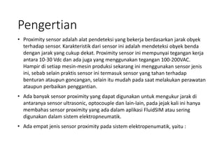 Dokumen ini menjelaskan berbagai jenis sensor proximity dalam sistem elektropneumatik, termasuk inductive, capacitive, optical, dan magnetic proximity sensor. Setiap sensor memiliki prinsip kerja dan aplikasi yang berbeda, seperti mendeteksi objek logam atau non-logam serta penggunaan dalam teknologi ponsel. Selain itu, terdapat tugas praktis untuk merancang rangkaian yang menggabungkan keempat jenis sensor tersebut.