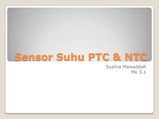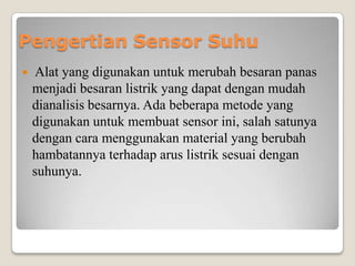 Dokumen ini menjelaskan tentang sensor suhu, khususnya termistor PTC dan NTC, yang mengubah suhu menjadi sinyal listrik. PTC memiliki resistansi yang meningkat seiring suhu meningkat, sedangkan NTC memiliki karakteristik kebalikan di mana resistansinya menurun saat suhu meningkat. Aplikasi dari termistor ini termasuk mendeteksi suhu dan mengaktifkan relay serta indikator LED sesuai dengan perubahan suhu yang terdeteksi.