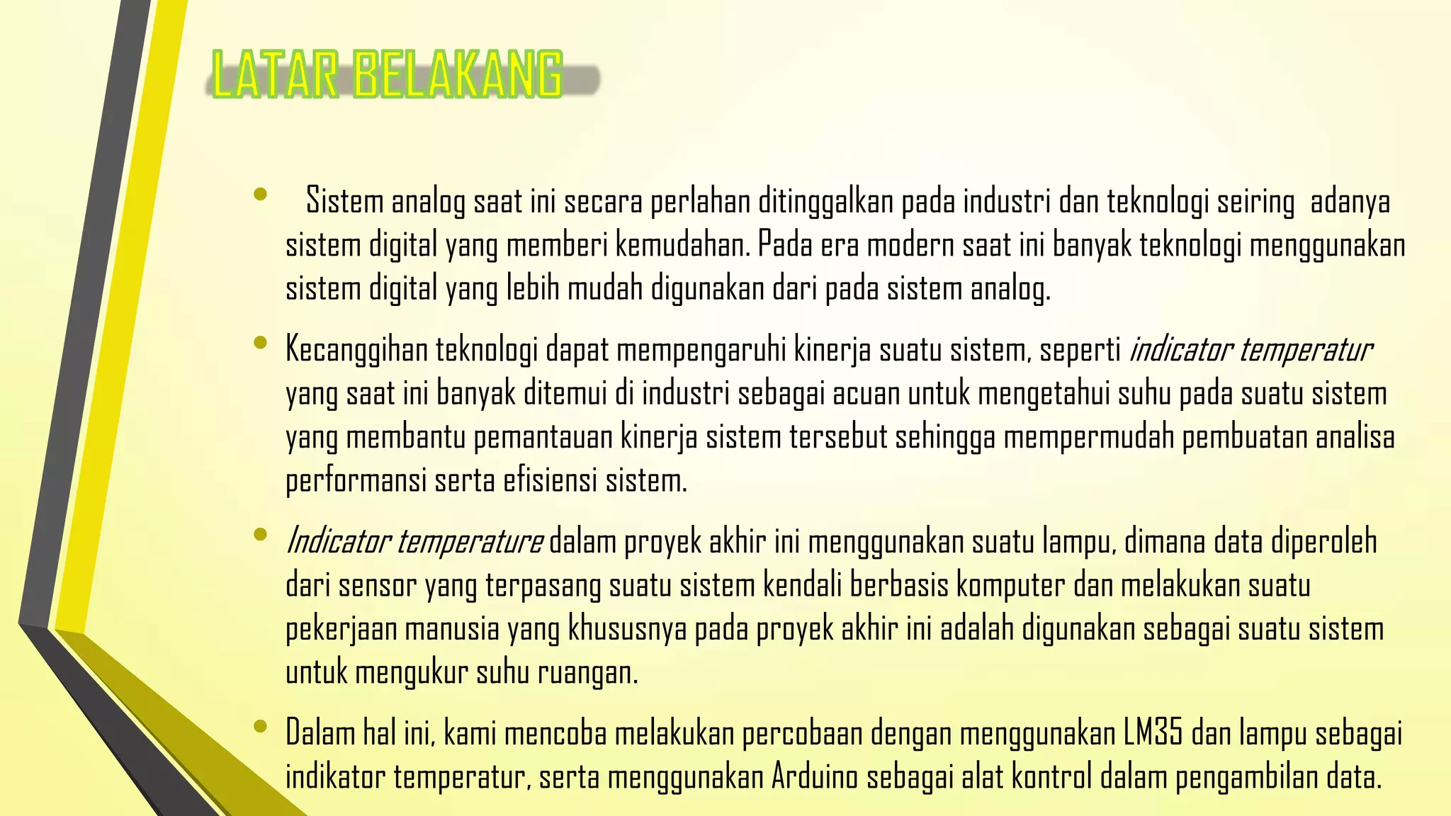 Dokumen tersebut membahas mengenai perancangan sistem indikator suhu ruangan menggunakan Arduino, sensor LM35, dan LED sebagai indikator. Sistem ini dapat mendeteksi suhu ruangan dan menyalaan LED berbeda berdasarkan rentang suhu yang diukur.