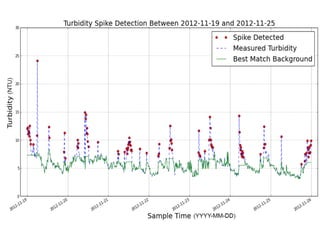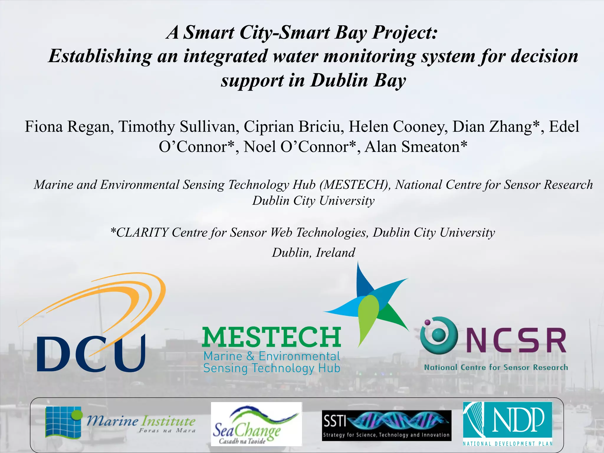 This document describes a project to establish an integrated water monitoring system in Dublin Bay using multiple sensors and visual sensing technologies. The goals are to improve water quality monitoring, identify security threats and health hazards, and produce baseline water quality datasets. Sensors have been deployed at sites in Dublin Bay to continuously measure water parameters. Over 500,000 sensor measurements and 2.5 million images have been collected. Data analysis uses machine learning methods to detect events like turbidity increases and predict variables. The network has improved understanding of Dublin Bay, but challenges remain regarding coverage, biofouling, costs and translating data into actionable information.