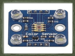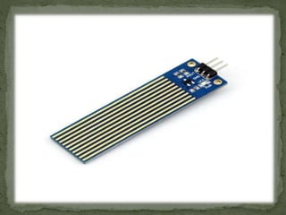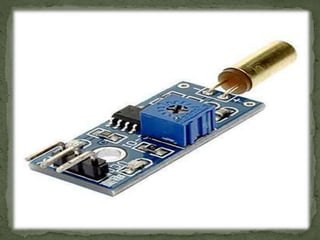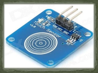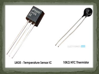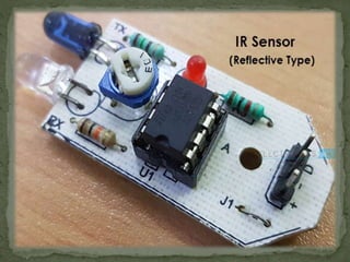 A sensor is a device that detects inputs from the environment such as light, heat, motion, pressure and converts it into a readable output. Common sensors include temperature sensors, proximity sensors, accelerometers, infrared sensors, pressure sensors, light sensors, ultrasonic sensors, gas sensors, touch sensors, color sensors, humidity sensors, tilt sensors, and flow/level sensors. Temperature sensors are one of the most common and measure changes in temperature through changes in properties like resistance or voltage. Proximity sensors detect nearby objects without contact using techniques like optics, ultrasound, or capacitance. Infrared sensors detect objects using infrared light and are used for applications like proximity detection in phones.