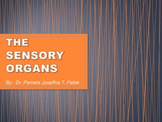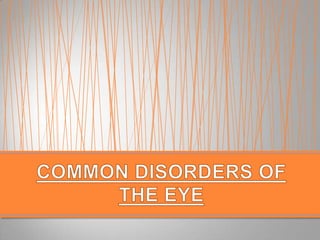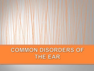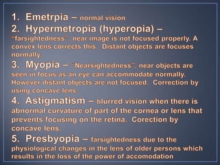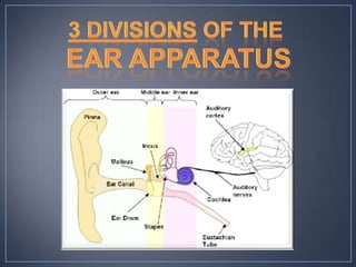 The document discusses the anatomy and physiology of the eye and ear. It describes the structures of the eye such as the coats, lacrimal apparatus, extraocular muscles, and refractive media. Common eye disorders like styes, conjunctivitis, glaucoma and strabismus are mentioned. The parts of the ear like the pinna, external auditory meatus, tympanic membrane, middle ear ossicles, inner ear bony and membranous labyrinths are outlined. Some ear diseases including otitis externa, media, Meniere's disease, and presbycusis are briefly discussed.
