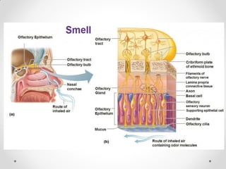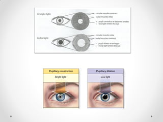 This document summarizes the key sensory organs - eye and ear. It describes the main structures of the eye such as the eyelids, lacrimal apparatus, extraocular muscles, coats of the eyeball, light transmitting structures and the mechanism of vision. It also discusses accommodation and common eye diseases. Regarding the ear, it outlines the external, middle and internal parts, and describes structures like the tympanic membrane, ossicles and cochlea which are important for hearing. The vestibule and semicircular canals are also mentioned as parts of the inner ear involved in equilibrium.