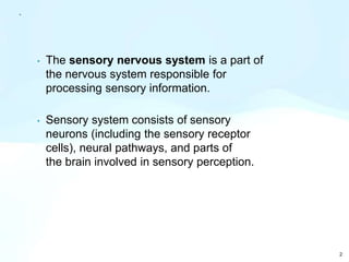 1) The sensory nervous system processes sensory information through sensory neurons, pathways, and brain areas.