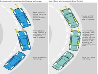 Sensotronic Brake Control (SBC) is an electronically controlled braking system that allows for faster and more precise braking than conventional hydraulic braking systems. SBC uses electronic sensors and controllers to monitor brake pedal input and wheel speeds and individually modulate brake pressure to each wheel. This provides for improved emergency braking, driving stability, braking comfort, and features like soft stops and hill hold. While SBC is more complex and expensive than traditional brakes, it paves the way for advanced driver assistance technologies and fully autonomous vehicles.