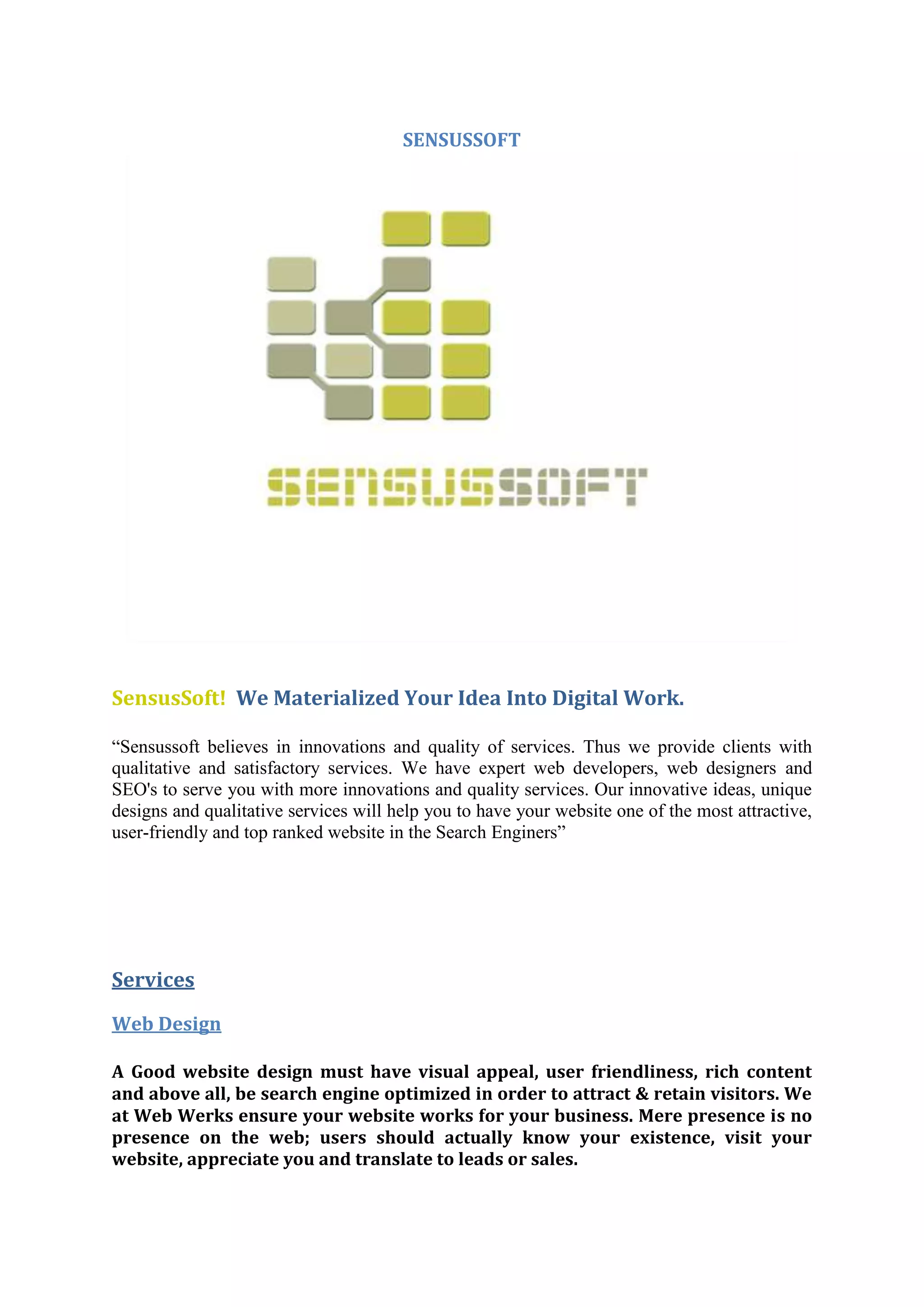SensusSoft is a digital agency that provides various web development and design services including web design, development, website redesign, promotion, hosting, and graphic design. They have a team of expert developers, designers, and SEO specialists who aim to create innovative, unique, user-friendly websites that help clients attract and retain visitors through superior design, content, and search engine optimization. Their goal is to materialize clients' ideas into high-quality digital work.
