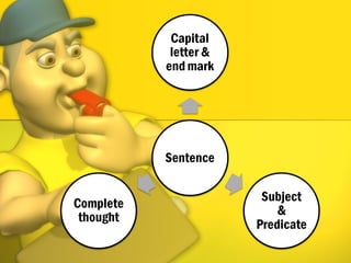 The document discusses the components of a complete sentence - that it must have a subject and a predicate. The subject is who or what is doing the action, and the predicate contains the verb and tells what the action is. It provides examples of different types of subjects and verbs. It then discusses how to identify complete sentences versus sentence fragments by looking for a subject and verb. Several examples of complete and incomplete sentences are analyzed.