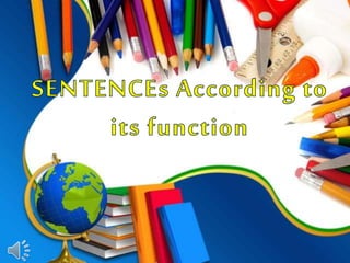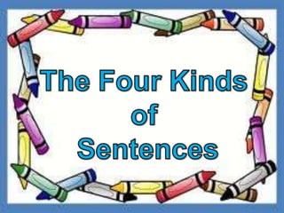 This document discusses the four types of sentences in English: declarative sentences make statements and end with a period, interrogative sentences ask questions and end with a question mark, imperative sentences give orders and can end with a period or exclamation point, and exclamatory sentences express strong feelings and end with an exclamation point. Examples are provided for each sentence type to illustrate their distinguishing features.