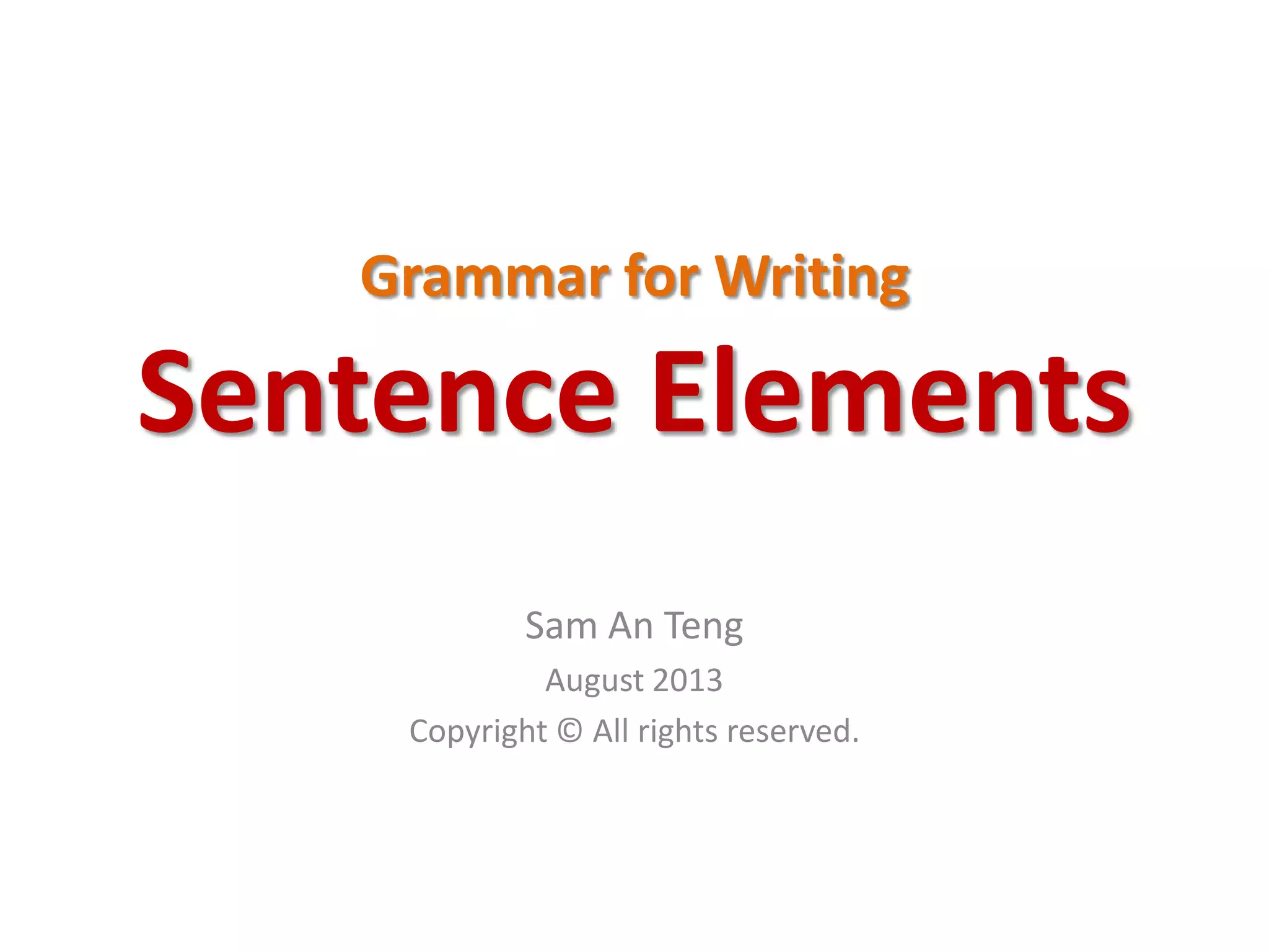 This document defines and provides examples of the five basic elements of a sentence: subjects, verbs, objects, complements, and adverbials. It explains that a subject is the person or thing performing the action of the sentence. A verb expresses the action or state of being. Objects receive the action of verbs. Complements add more meaning about the subject or object. Adverbials modify verbs or add circumstances. Examples are given for each element to illustrate their usage in simple sentences.