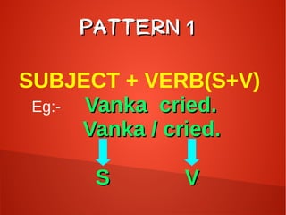 The document describes 7 basic sentence patterns in English: subject-verb (SV), subject-verb-object (SVO), subject-verb-complement (SVC), subject-verb-object-object (SVOO), subject-verb-object-complement (SVOC), subject-verb-adjunct (SVA), and subject-verb-object-adjunct (SVOA). It then provides examples of sentences for each pattern and defines the key elements - subject, verb, object, complement, and adjunct.