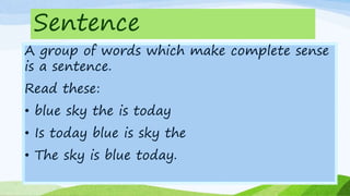 The document defines and provides examples of sentences, phrases, and clauses. A sentence is a group of words that makes complete sense on its own. A phrase is a group of related words that does not contain a subject and verb and is used as part of speech. A clause contains a subject and verb and can express a complete thought, either as part of a sentence or as a standalone sentence.