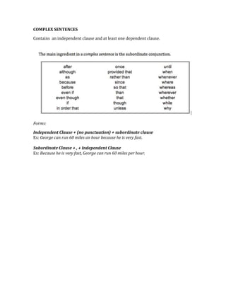 The document defines three types of sentences: simple sentences containing one independent clause, compound sentences containing two or more independent clauses joined with coordinating conjunctions or semicolons, and complex sentences containing one independent clause and at least one dependent clause. Examples are provided for each sentence type to illustrate their structures.