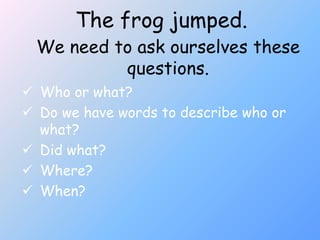This document provides a method for summarizing sentences by identifying the subject, verb, and any modifiers like location or time. It suggests asking questions about who or what the subject is, what action they took, where and when to fully understand the key elements of the sentence.