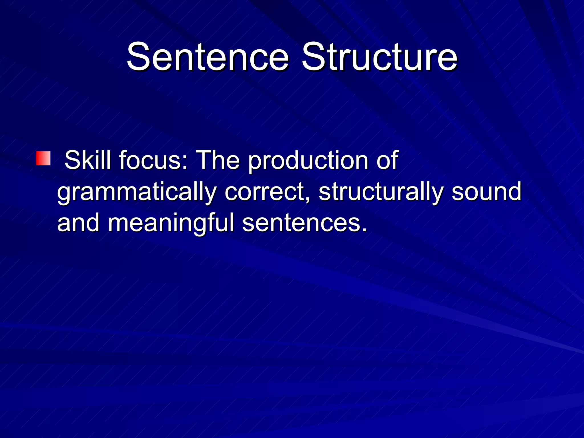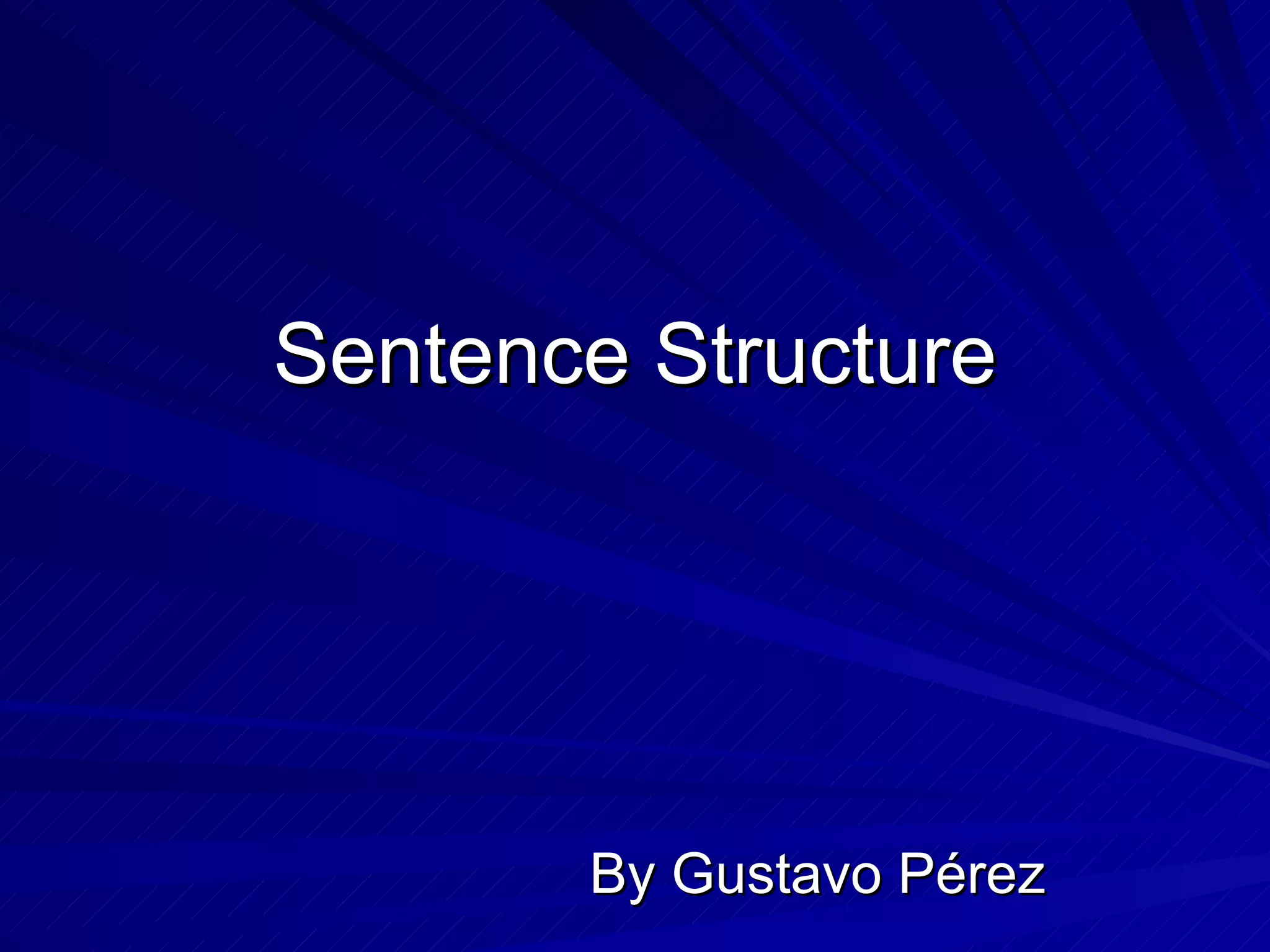 This document discusses sentence structure and the different types of sentences. It defines clauses, independent clauses, and dependent clauses. Simple sentences contain one independent clause, compound sentences contain two or more independent clauses, and complex sentences contain one independent clause and one or more dependent clauses. The document also describes the different types of dependent clauses - adjective clauses, adverb clauses, and noun clauses. Finally, it defines compound-complex sentences as containing two or more independent clauses and one or more dependent clauses.