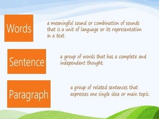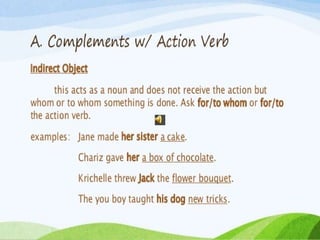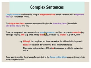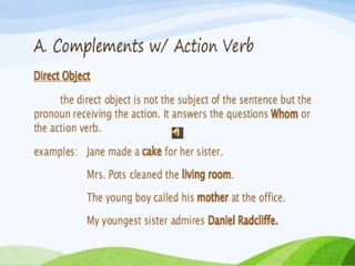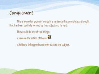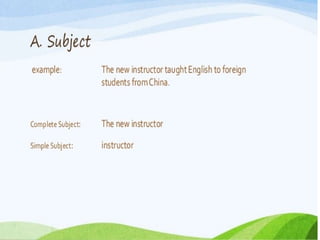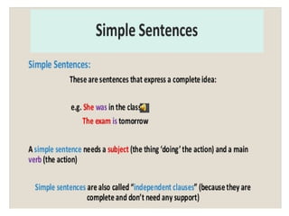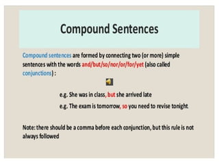 The document explains the concept of subjects and predicates in sentences, including their types such as complete, simple, and compound subjects, as well as complete and simple predicates. It also describes different sentence structures including simple, compound, complex, and compound-complex sentences, along with examples for each type. Additionally, it covers coordinating and subordinating conjunctions that connect clauses within these sentences.