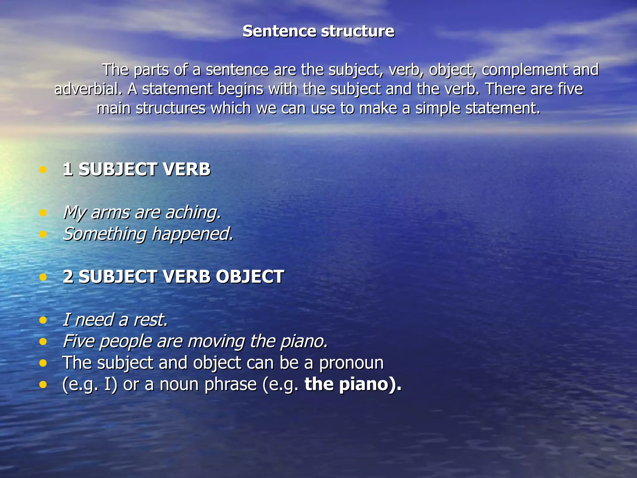 The document discusses the parts of a sentence and the five main structures used to make simple statements: 1) subject verb, 2) subject verb object, 3) subject verb complement, 4) subject verb adverbial, and 5) subject verb object object. It explains that the subject and verb form the basic structure of a statement, and that other parts like objects, complements, and adverbials can be added to provide more information. Adverbials can also be added to all five of the main structures.