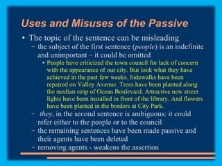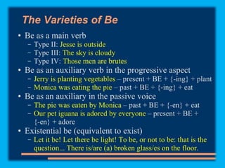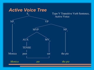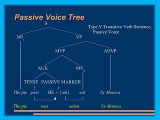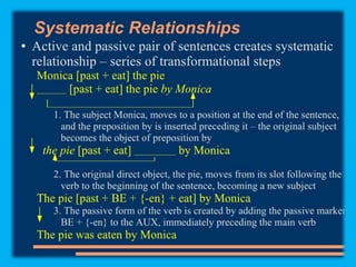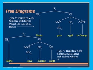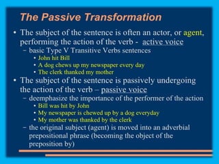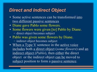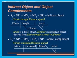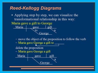 This document discusses sentence transformations in English grammar. It begins by explaining that sentence transformations allow language to be more complex and varied by moving, adding or deleting words. It then provides examples of the indirect object transformation, where a prepositional phrase following a direct object can be removed and the object it referred to becomes the indirect object. The document also discusses other types of sentence transformations like passive voice, negatives, questions, exclamations and imperatives. It provides rules and structural formulas for performing each of these transformations.