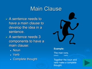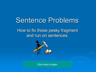 The document provides information on how to identify and fix sentence fragments and run-on sentences. It discusses that a complete sentence needs a subject, verb, and complete thought. Sentence fragments are missing one of these key components, while run-on sentences improperly combine two independent clauses without punctuation. The document offers examples of fragments and run-ons and provides interactive exercises for the reader to identify these issues in sample sentences.