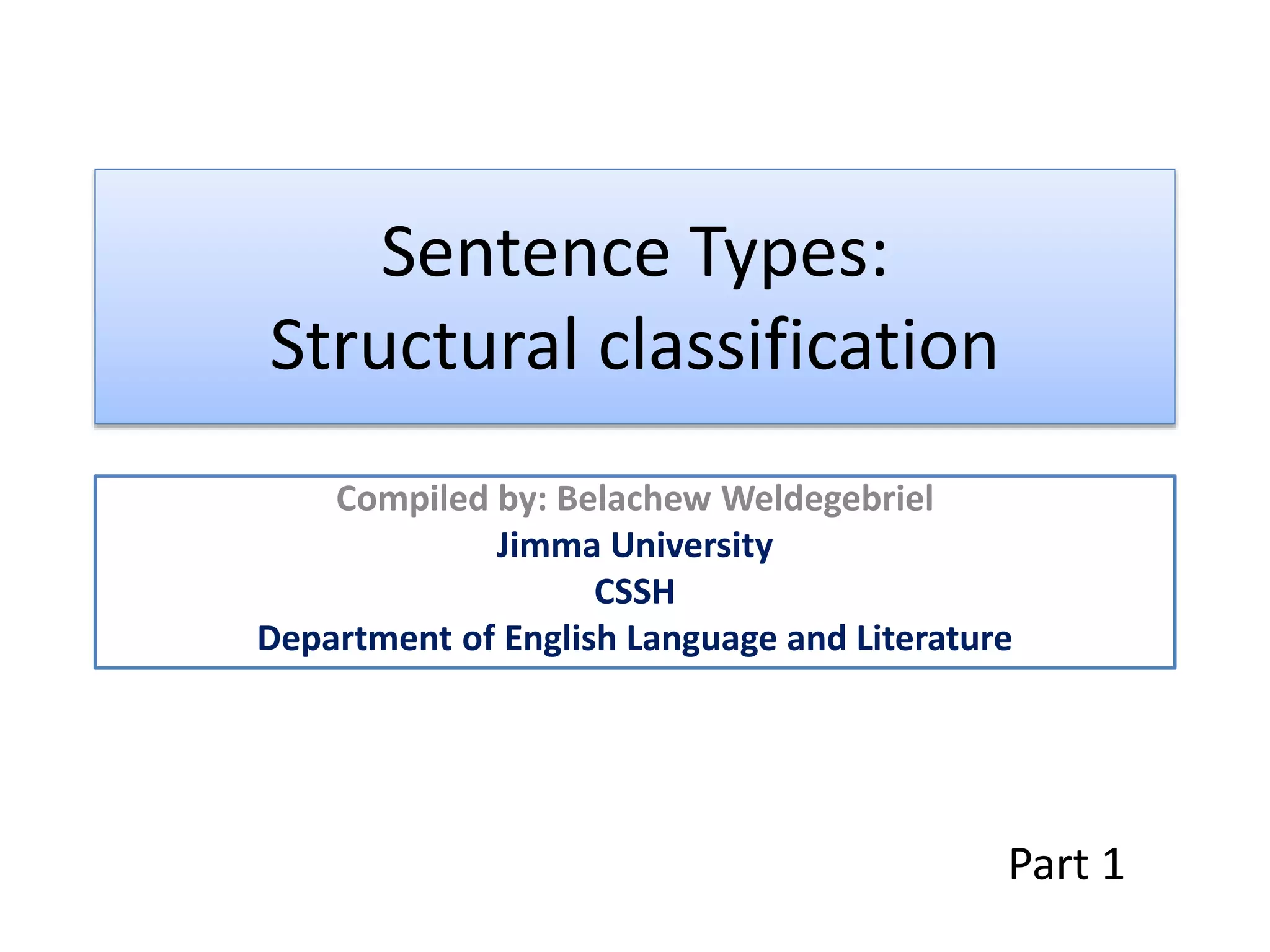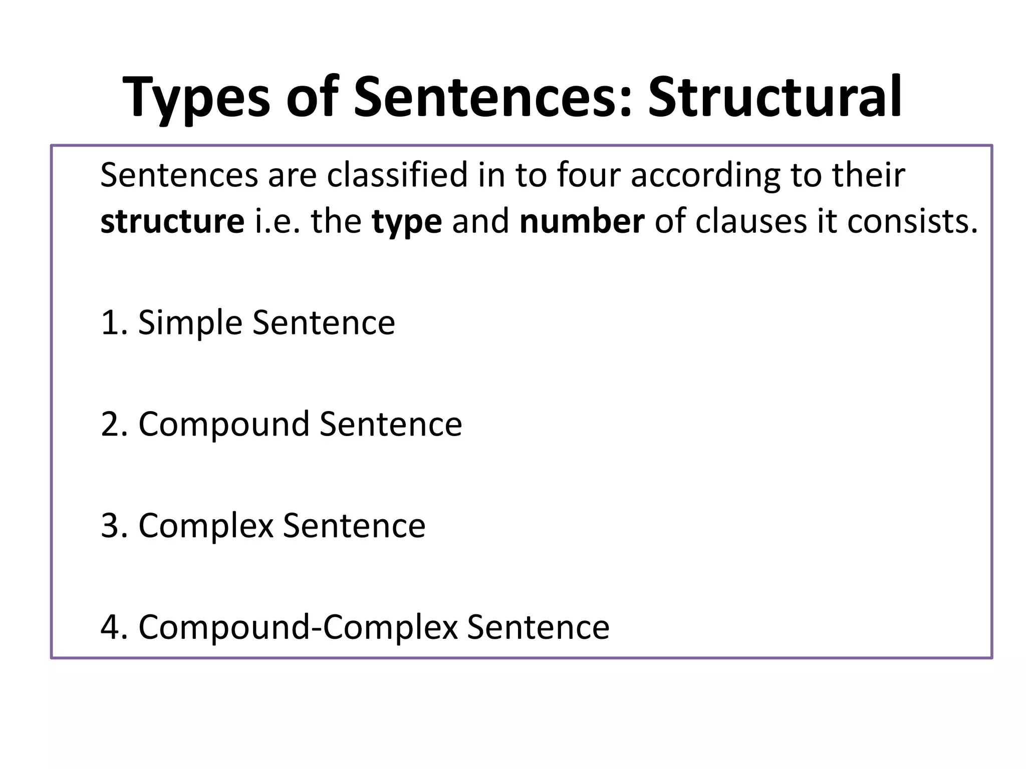The document classifies sentences into four types based on their structure: simple, compound, complex, and compound-complex. Each type is defined by the number of clauses it contains, with examples provided for clarity. Simple sentences consist of a single independent clause, compound sentences consist of two or more independent clauses, and complex sentences include at least one dependent clause.