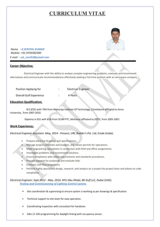 This curriculum vitae outlines the qualifications and experience of K. Senthil Kumar, an electrical engineer seeking a position with an aerospace company. He has a Bachelor's degree in electrical engineering with over 70% marks and over 4 years of experience in electrical engineering roles in India and the UAE. His experience includes managing electrical projects, site coordination, system programming, maintenance, and ensuring compliance with safety standards. He has training in lighting control, access control, security, and building management systems.