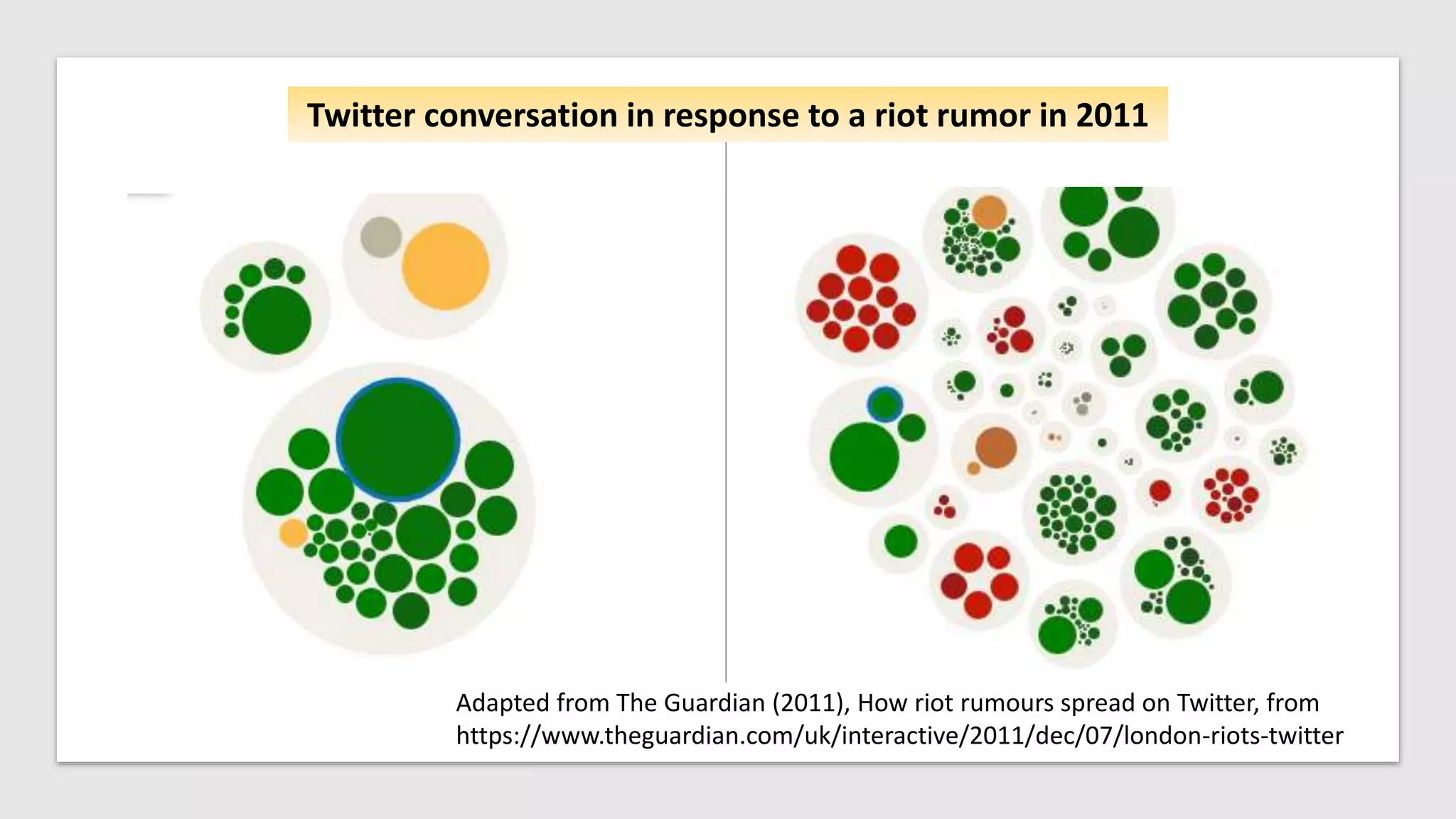 The document summarizes three different Twitter conversations: 1) A conversation in 2011 in response to a London riot rumor, 2) A 24-hour conversation during the FIFA World Cup, and 3) A study of the temporal pattern of happiness on Twitter from 2008 to 2011 which found variations in the expression of positive emotions over days of the week and times of day.