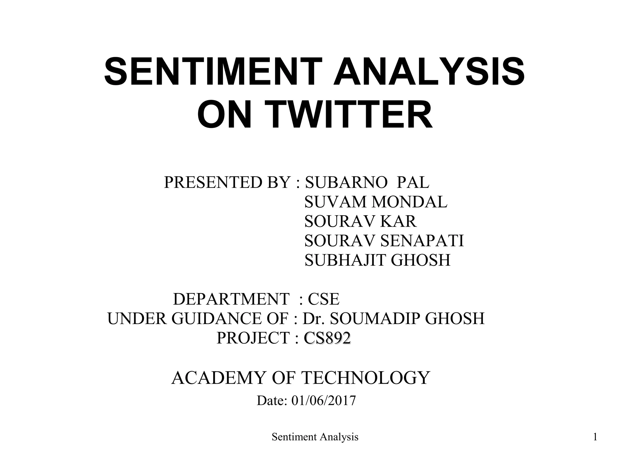 The document presents a comprehensive overview of sentiment analysis on Twitter, discussing its methodology, datasets, and various models such as k-nearest neighbors and recurrent neural networks. It emphasizes data preprocessing, cleaning steps, and the implementation of advanced models like LSTM for improved accuracy. The project highlights practical applications, future improvements, and references to related works in the field.