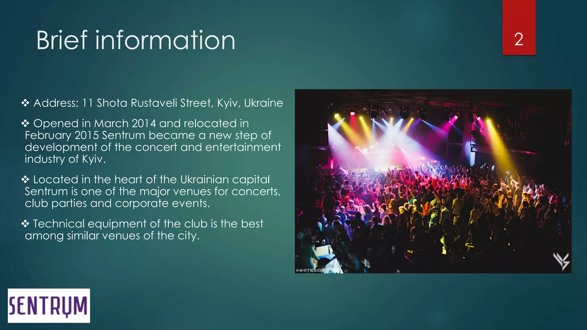Sentrum is a concert hall and nightclub located in Kiev, Ukraine that opened in 2014. It has a total area of approximately 1,000 square meters and can accommodate up to 1,200 people for concerts and 1,000 for nightclub parties. Since opening, Sentrum has hosted over 60 concerts and 100 shows in its first year, featuring artists like Steve Vai, Onuka, and Swans. It also holds nightclub parties on weekends with DJs playing various electronic music genres. Sentrum rents its space to promoters and generates additional income from bar sales. It also hosts corporate events such as banquets and presentations.