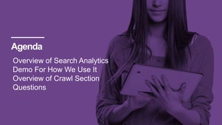 The document outlines best practices for using Google Search Console, emphasizing the importance of monitoring site performance and optimizing for user engagement. It covers various functionalities, including search analytics, crawl sections, and mobile usability, along with tips on improving click-through rates and managing site errors. The document also provides guidance on accessing different features and preparing for future lessons on SEO tools.
