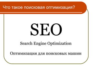Документ обсуждает поисковую оптимизацию (SEO) и ее важность для привлечения целевой аудитории в интернете. Он анализирует различные аспекты SEO, такие как семантическое ядро, структура сайта и уникальный контент, а также факторы, влияющие на рейтинг сайта. В заключение подчеркивается необходимость комбинирования SEO с контекстной рекламой для достижения наилучших результатов.