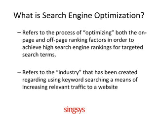 Search engine optimization (SEO) refers to optimizing on-page and off-page ranking factors to achieve high search engine rankings. SEO is important because 85% of internet traffic comes from search engines, and users rarely view results past the first page. Search engines rank pages using algorithms that consider on-page factors like titles, headers, and content, as well as off-page factors like links and anchor text. Proper use of titles, meta tags, headings, images, URLs, and internal linking helps websites rank higher in search results.