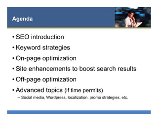 The document provides an overview of search engine optimization (SEO) best practices. It discusses the importance of on-page optimization elements like title tags, meta descriptions, images and body content. It also covers off-page optimization tactics like building high-quality links from relevant sites. Additionally, the document outlines tools for keyword research, site audits and technical SEO checks. The goal is to help websites improve their visibility and rankings on search engines through both on-page and off-page optimization strategies.