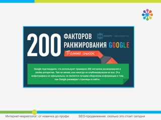 Документ рассматривает стоимость SEO-продвижения и его историческое развитие, выделяя ключевые аспекты, такие как алгоритмы, бессылочное ранжирование и факторы, влияющие на видимость в поисковых системах. Основное внимание уделено различию между платным трафиком и органическими позициями, а также важности кликабельности в контексте успешного продвижения. В конце подчеркивается, что SEO — это сложный механизм, требующий профессионального подхода для достижения желаемых результатов.