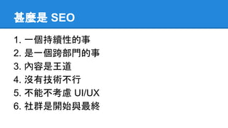 本文提供了关于SEO的基本要素和检查清单,包括持续性的工作、内容的重要性和技术要求。文中提到的工具和分析项目强调了网站性能和优化的必要性。此外,还提供了详细的meta-data标签和Google分析设置的指导。