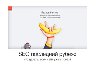 Документ рассматривает стратегии и методы SEO-оптимизации для сайтов, уже находящихся на высоких позициях. Основное внимание уделяется расширению семантического ядра, оптимизации конверсии и работе с дополнительными каналами, такими как ретаргетинг и социальные сети. Также упоминаются важные метрики успешности, такие как трафик, лиды и другие KPI.