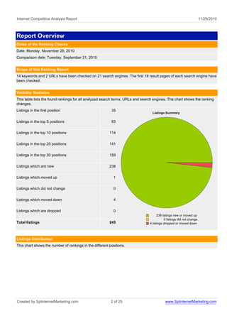 This report was created by Splinternet Marketing and analyzes the search engine rankings of keywords and URLs related to internet marketing over time. It found that rankings improved significantly across many search engines, with 239 new or improved listings and only 4 declined listings. Keywords like "internet marketing guaranteed roi" and "splinternet marketing" achieved top rankings on search engines like AllTheWeb and AltaVista.