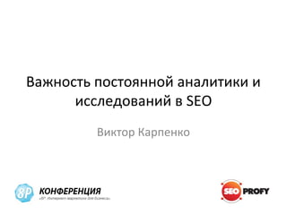 В документе Виктора Карпенко подчеркивается важность постоянного анализа и экспериментов в SEO для снижения рисков и улучшения результатов. Он делится своим опытом, экспериментами и исследованиями в области поискового продвижения, а также выделяет ключевые аспекты, такие как реакция на алгоритмы поисковиков и анализ трафика. Карпенко призывает к постоянной практике и внедрению изменений для достижения успешных результатов в SEO.