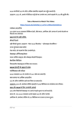 आज की दुनिया में, जहाँ हर व्यवसाय ऑनलाइन हो रहा है, वहाँ सर्च इंजन ऑप्टिमाइजेशन (SEO) और मल्टी-लेवल मार्केटिंग (MLM) दोनों का महत्व तेजी से बढ़ रहा है। यह ब्लॉग SEO की समझ और इसे सही तरीके से करने के तरीके को MLM इंडस्ट्री की ग्रोथ से जोड़कर प्रस्तुत करेगा।