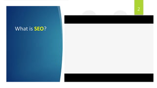 SEO is the process of optimizing a website to increase its ranking in search engine results pages without requiring any payments. The SEO process involves optimizing elements like meta tags, building links from other websites, creating high-quality content, and improving site speed. Key factors that determine search engine rankings are the website content, HTML code, and number of backlinks from other sites. Tracking SEO results and making adjustments based on analytics helps improve rankings over time.