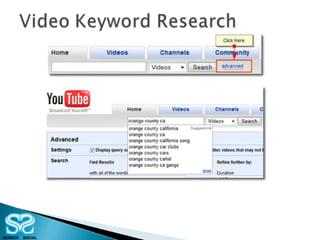 This document provides tips and guidelines for optimizing video files and metadata, hosting videos, submitting videos to search engines, and monetizing videos. It discusses adding descriptive metadata to video files using tools like XnView and Adobe Bridge. It also covers hosting options like TubeMogul and Traffic Geyser, submitting video sitemaps and MRSS feeds to Google, and using iTunes metadata tags.