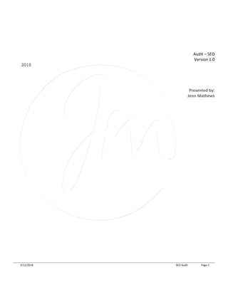 This document provides an SEO audit of a client's website. It analyzes the site architecture, content, and technical SEO elements like keywords, page titles, links and redirects. Issues found include duplicate content, non-keyword rich URLs, missing meta descriptions and the need for XML sitemaps. The audit summarizes findings, outlines next steps the client should take and packages recommended technical services.