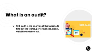 An SEO audit analyzes a website to evaluate performance factors like traffic, technical errors, and user experience. The audit examines the website's objectives, domain authority, keyword strategy, competitors, technical elements, page content, user experience, backlinks, and social media presence. The goal is to identify optimization opportunities to improve the website's performance and rankings. Key areas covered include speed, redirects, duplicate content, broken links, user behavior metrics, backlink quality and relevance, and social media engagement.